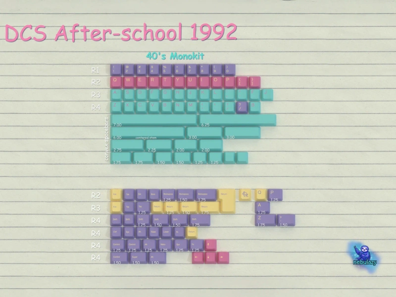 DCS After School 1992 is a 40s-only keycap set featuring a vintage 90s vaporwave colourway. Produced by Signature Plastics in the classic DCS profile, it pairs bold retro colours with crisp legends and compact-focused kitting, including full QAZ support. A perfect fit for small keyboards that embrace the iconic 90s aesthetics.