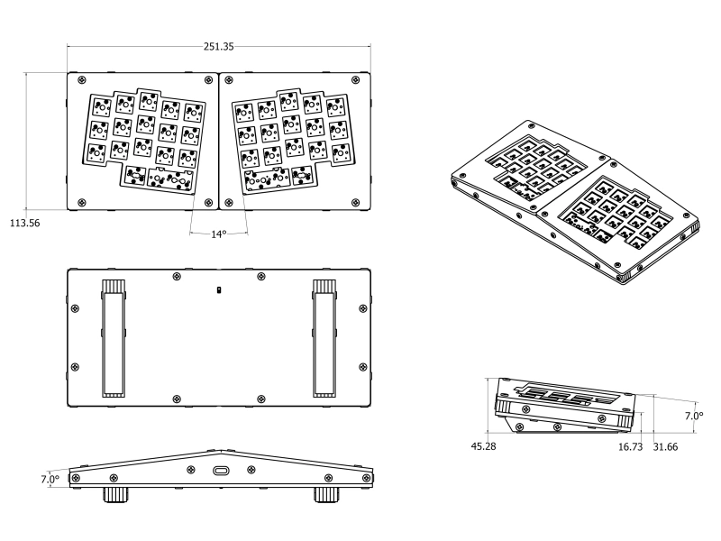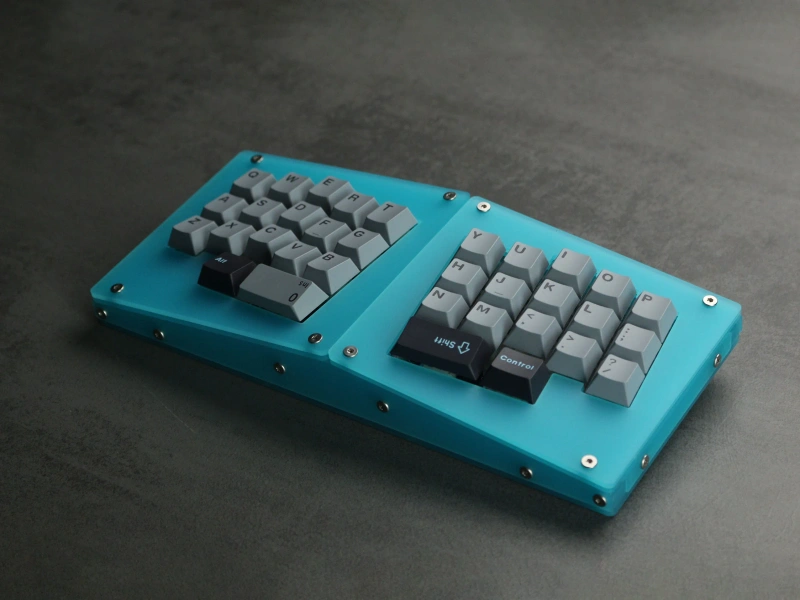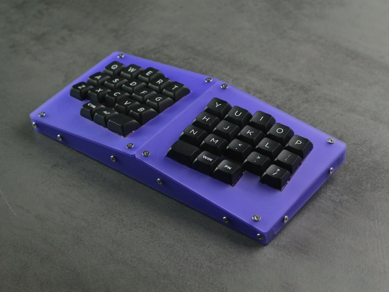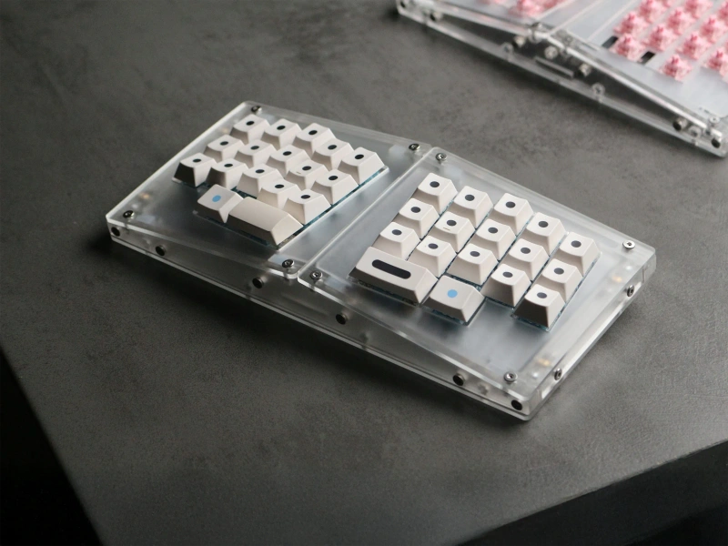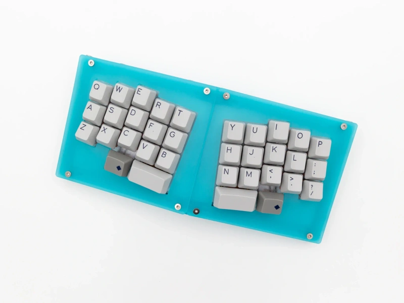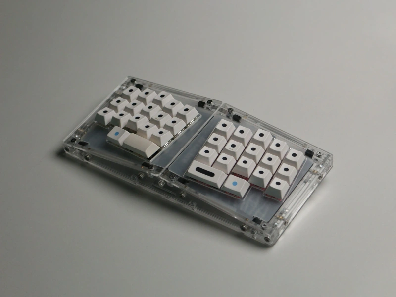 Designed by Dino, El Chibre is a compact tented keyboard that blends the Le Chiffre layout with a stacked acrylic case inspired by the Libra Mini. With 7° of tenting, a 7° typing angle and a 7° split, it provides a comfortable, ergonomic typing experience in a small footprint.